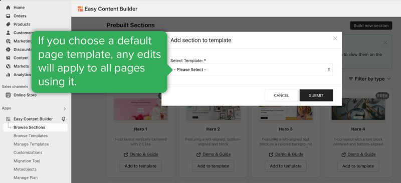 - Step 1: Click Apps > Easy Content Builder > Browse Sections.