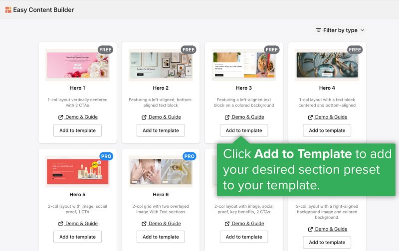 - Step 2: Find your desired section preset and click Add to Template to add it to your template.