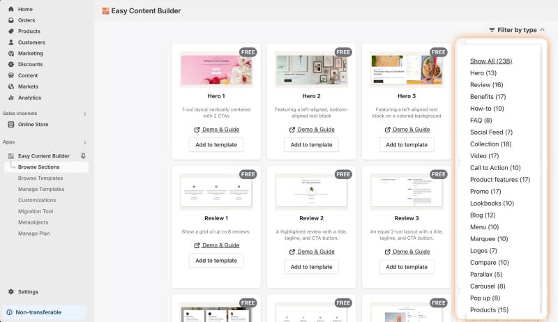 Easy Content Builder offers over 238 section presets that cover all the key features your store might need, like Hero, Reviews, Benefits, How-to guides, FAQs, Social Feeds, Lookbooks, Marquees, Comparison Charts, Parallax, etc.