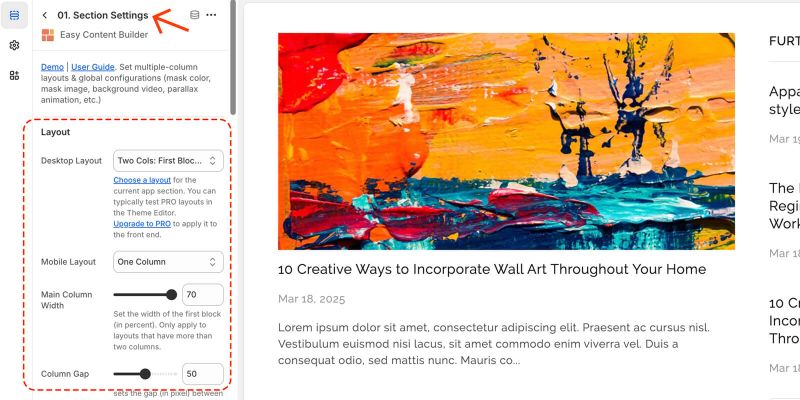 - In this special section, you can specify multi-column layouts, activate full width, determine the section's maximum width, choose a background color, and set global margins and padding, among other options.