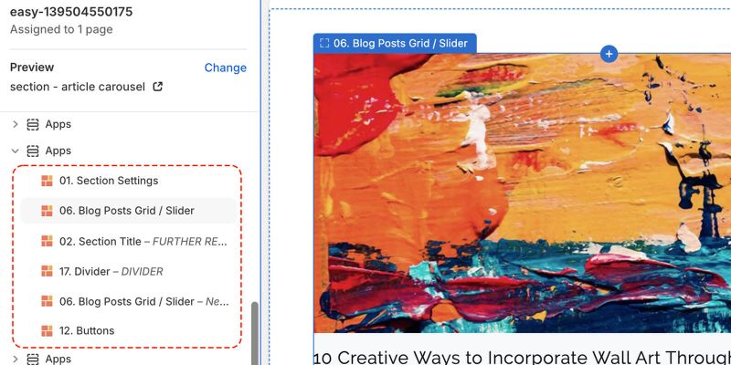 After adding the section, you'll be taken to the Theme Editor, where you'll see a list of blocks like in the screenshot below: You can add, edit, configure, and reorder the blocks in that section as needed.